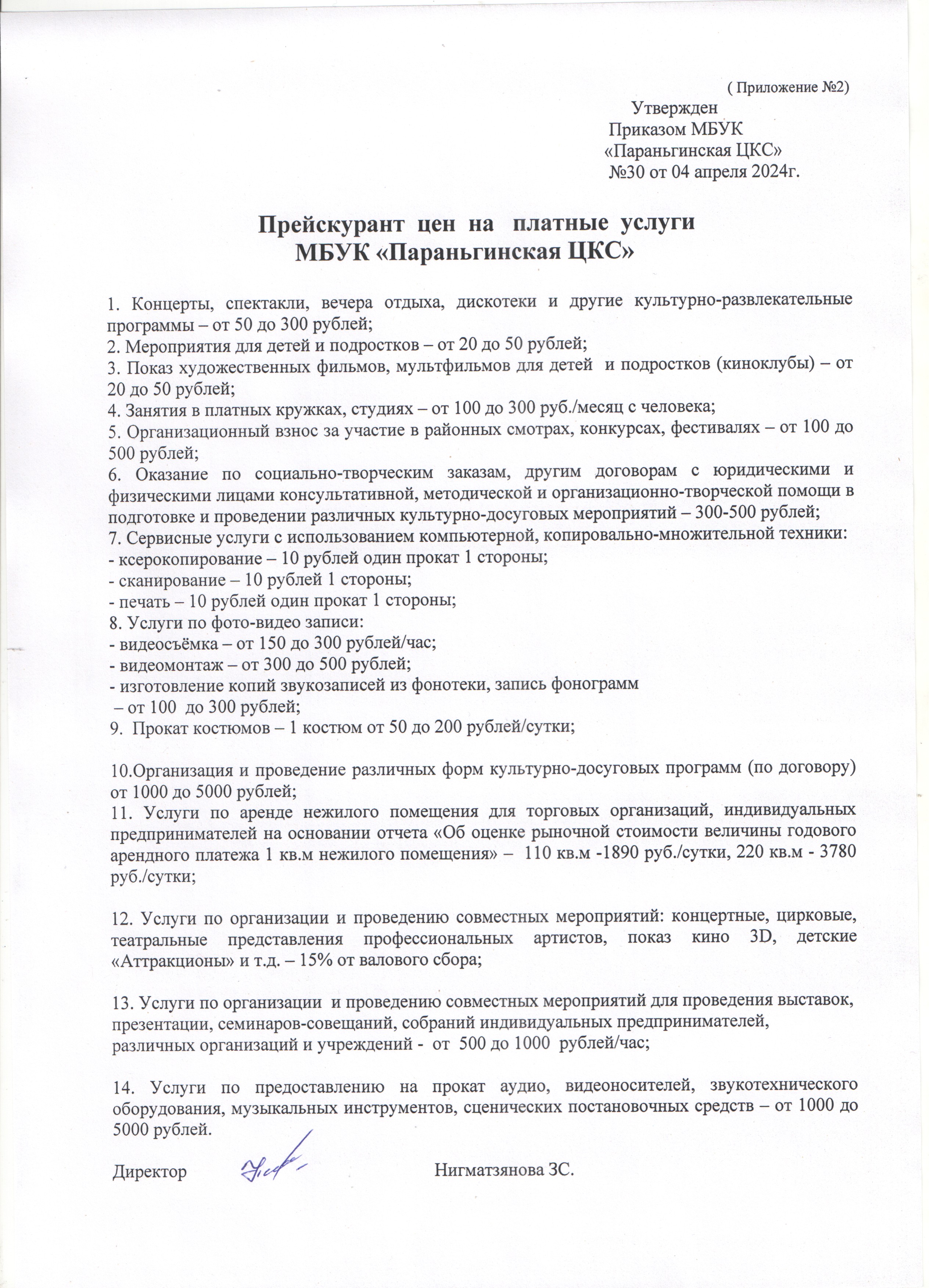 ПРИЛОЖЕНИЕ №2 Прейскурант цен на платные услуги МБУК «Параньгинская ЦКС»